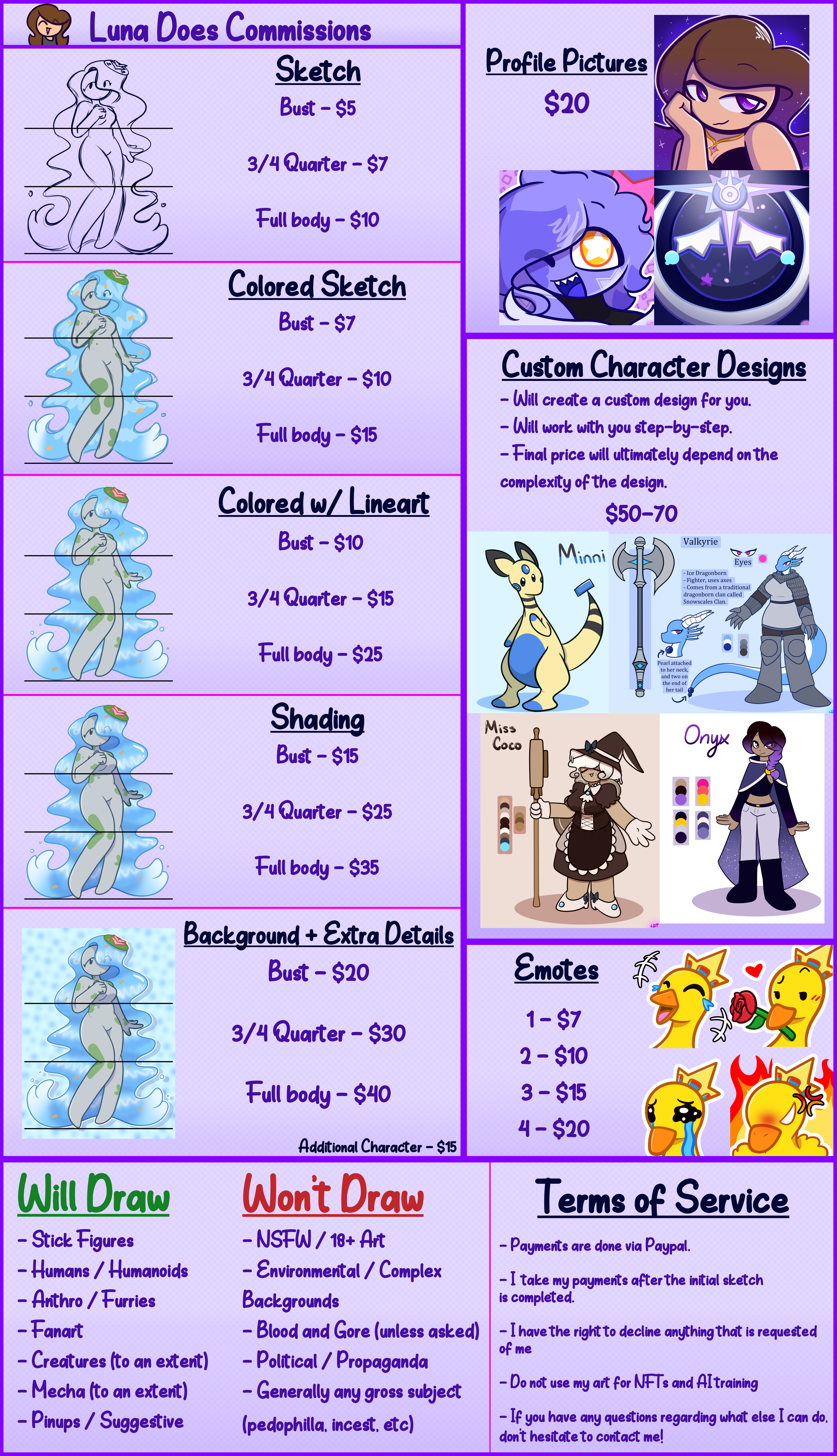 Hi there! I'm Luna! I go by LunaDrawsTrash or LunaGal727. I'm an artist that creates too many characters, I strive to create stories and to make people smile with my work!